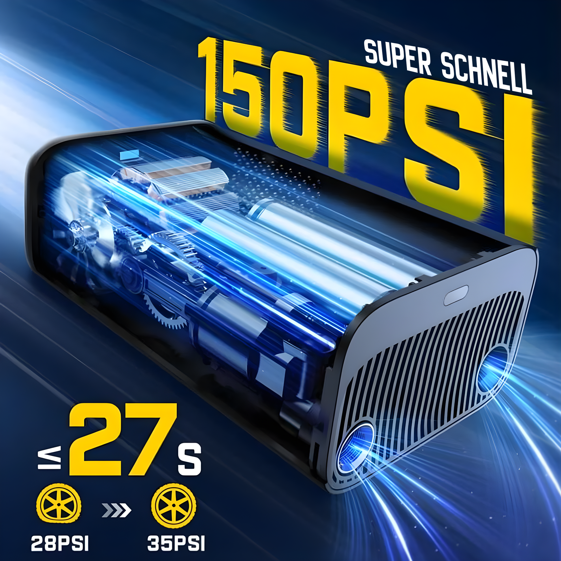 Machen Sie Ihre Reifen in wenigen Minuten einsatzbereit – mit 150 PSI für schnelle und zuverlässige Inflation.